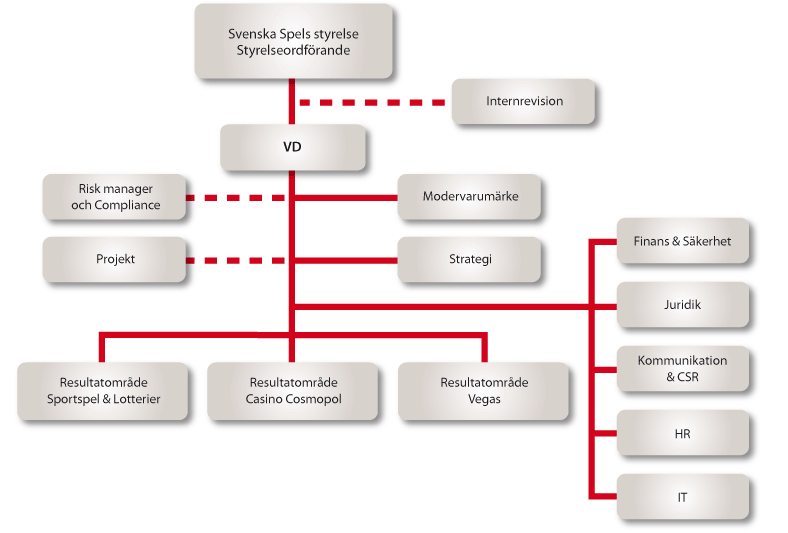 Enheter med streckade linjer rapporterar direkt till VD, men ingår organisatoriskt i någon av staberna. Den nya organisationen omfattar bland annat tre resultatområden, vilka i organisationen 2011 benämndes affärsområden. I Årsredovisning 2011 används genomgående benämningen affärsområden för dessa. Organisationen 2011 utgjordes av tre affärsområden, två verksamhetsområden och fyra staber.