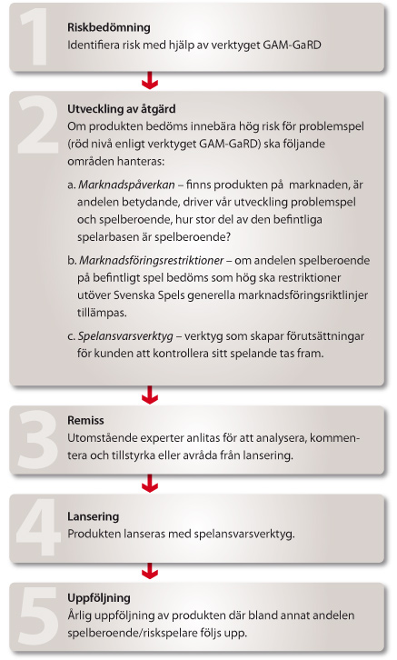 Svenska Spels produkter genomgår alltid en riskutvärdering innan de utvecklas. När det gäller spel som bedöms medföra hög risk för problemspel eller beroende är processen mera omfattande.