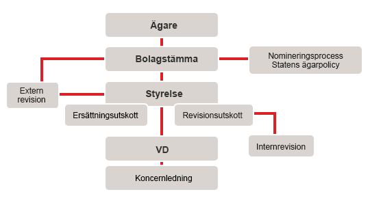 Bolagsstyrningen av statligt ägda bolag framgår av Ägarpolicyn. En viktig del av styrningen är att Svensk kod för bolagsstyrning (Koden) ska tillämpas i statligt majoritetsägda bolag. I vissa frågor har regeringen funnit skäl, att i överensstämmelse med Kodens princip ”följa eller förklara”, motivera vissa avvikelser från Koden. Exempel på sådana avvikelser är Kodens bestämmelser som rör beredning av beslut om nominering av styrelse och revisorer.