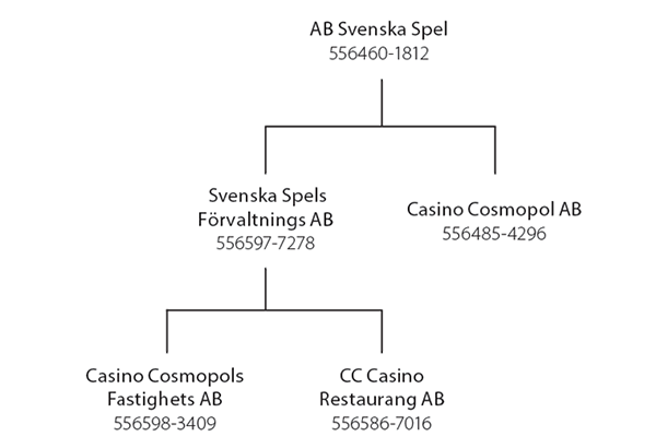 I koncernen Svenska Spel ingår moderbolaget AB Svenska Spel och dotterbolagen Svenska Spels Förvaltnings AB och Casino Cosmopol AB. Svenska Spels Förvaltnings AB bildar en underkoncern med dotterbolagen Casino Cosmopols Fastighets AB och CC Casino Restaurang AB. Playscan AB har per den 2015-11-02 fusionerats i moderbolaget AB Svenska Spel.