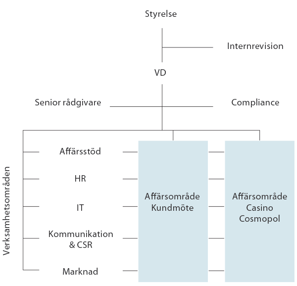 Koncernen är organiserad i två affärsområden; Kundmöte och Casino Cosmopol, samt fem verksamhetsområden (Affärsstöd, HR, IT, Kommunikation & CSR och Marknad).